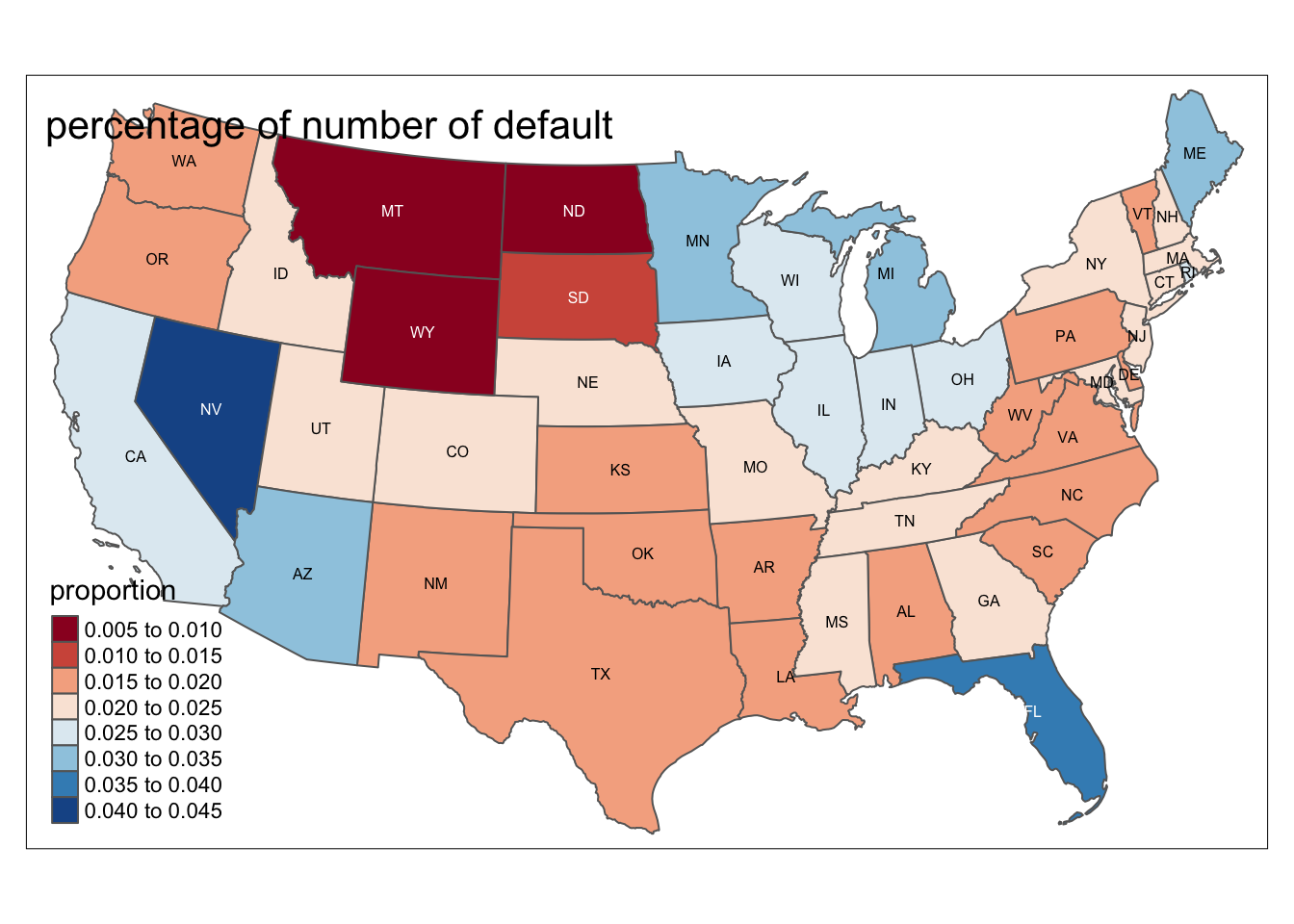 us_cont %>% inner_join(p, by = c("STUSPS" = "state_orig_time")) %>% tm_shape() + tm_polygons(col = "proportion",palette = "RdBu") + tm_text("STUSPS", size = 1/2) + tm_layout(title= 'percentage of number of default')