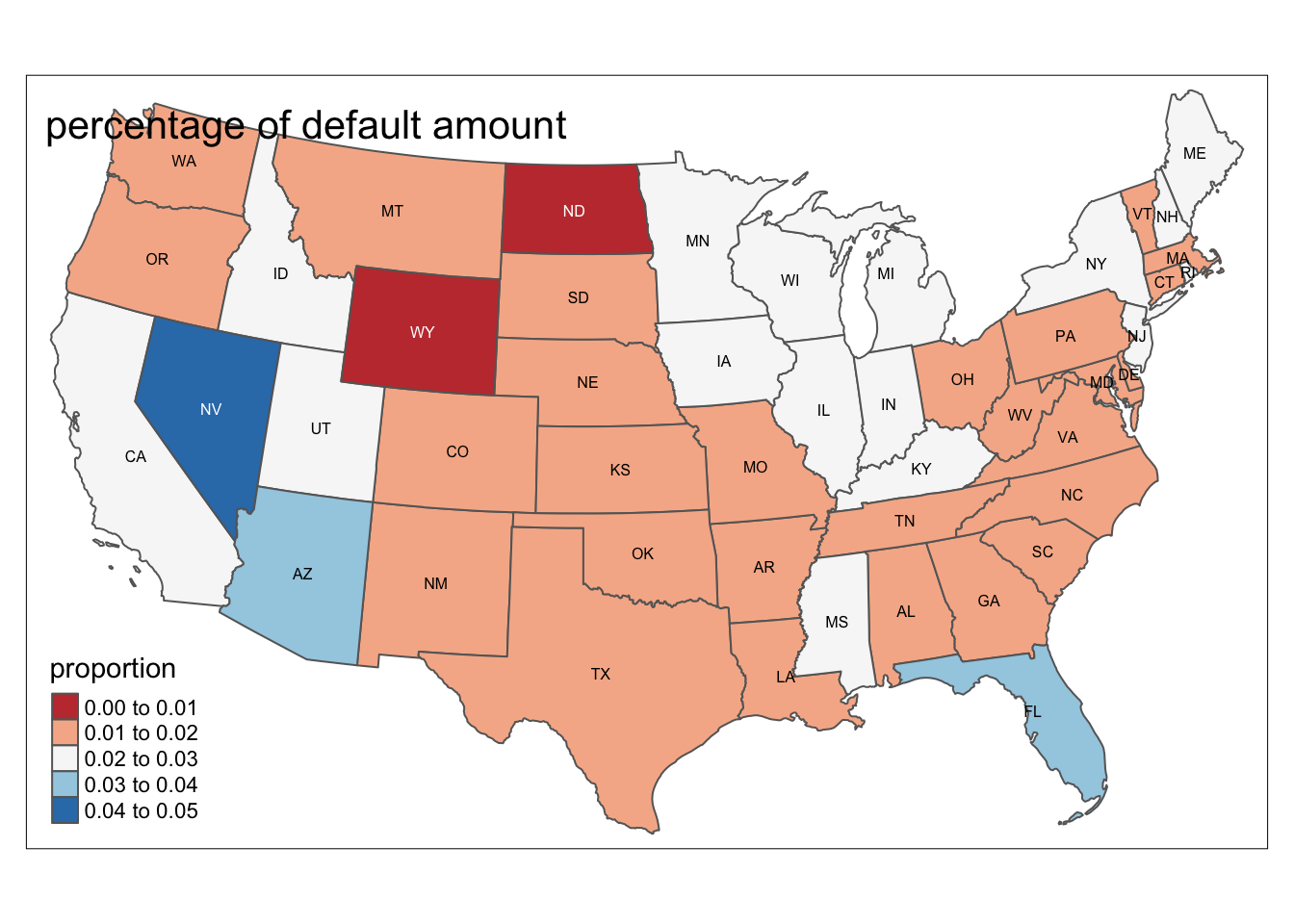 us_cont %>% inner_join(q, by = c("STUSPS" = "state_orig_time")) %>% tm_shape() + tm_polygons(col = "proportion",palette = "RdBu") + tm_text("STUSPS", size = 1/2) + tm_layout(title= 'percentage of default amount')